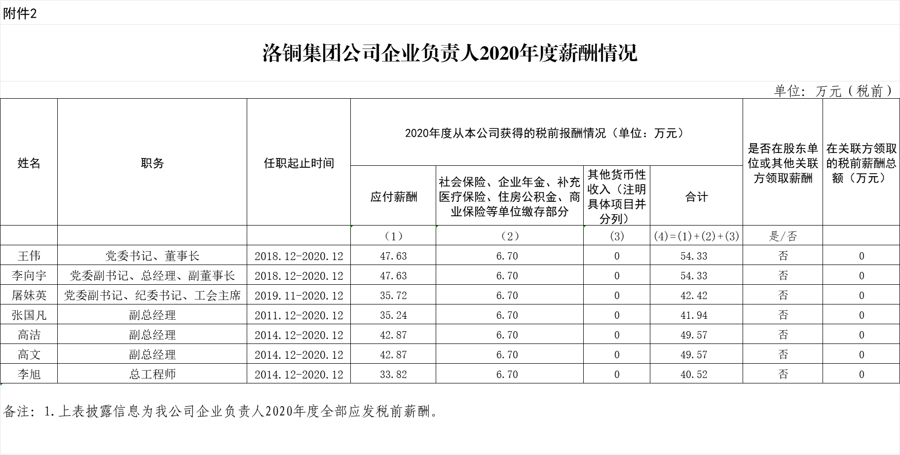 洛銅集團(tuán)公司企業(yè)負(fù)責(zé)人2020年度薪酬情況